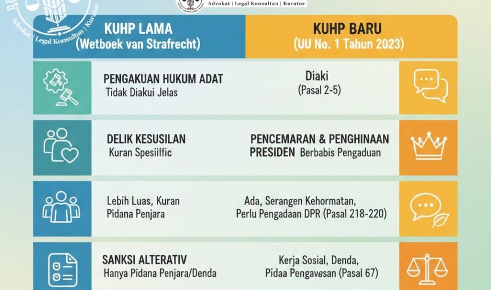 KUHP Baru mulai berlaku pada 2026, karena memiliki masa transisi 3 tahun. H2: Perbedaan Utama KUHP Baru dan KUHP Lama (SEO-friendly List)